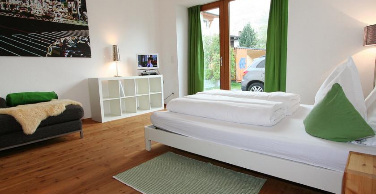 • Erdgeschoß: Schiraum mit Trocknern und großer Garderobe. Ein Doppelzimmer mit extra Couch und Zugang zum Garten.